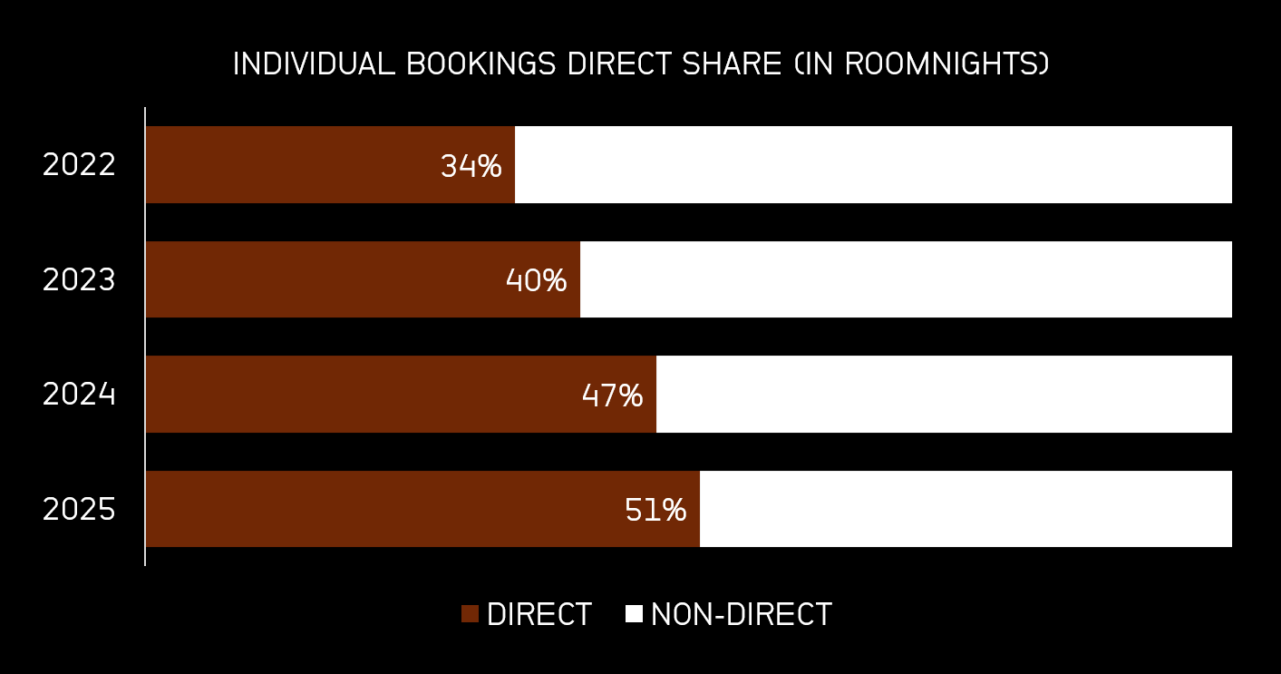 Since 2022, the share of bookings coming directly to the hotel has increased every single year, reaching 51% in 2025. Crossing this threshold is more than a milestone; it represents a structural change in profitability. Every booking that moves from a commission-based channel to a direct one is revenue that stays with the hotel.